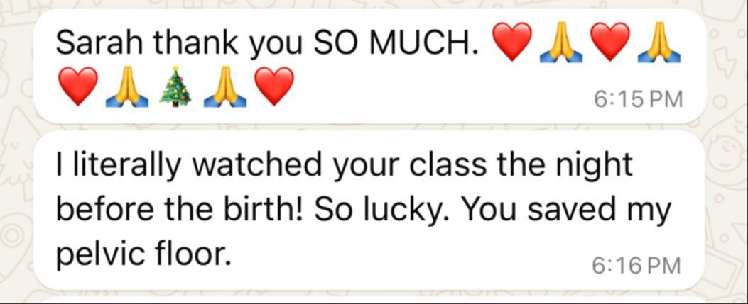 "I literally thought of Sarah in that moment of terrible pain and how I should inhale and relax the pelvic floor on my next contraction... and she came falling out! Sarah, thank you SO MUCH... You saved my pelvic floor." – Maggi, mom of 2